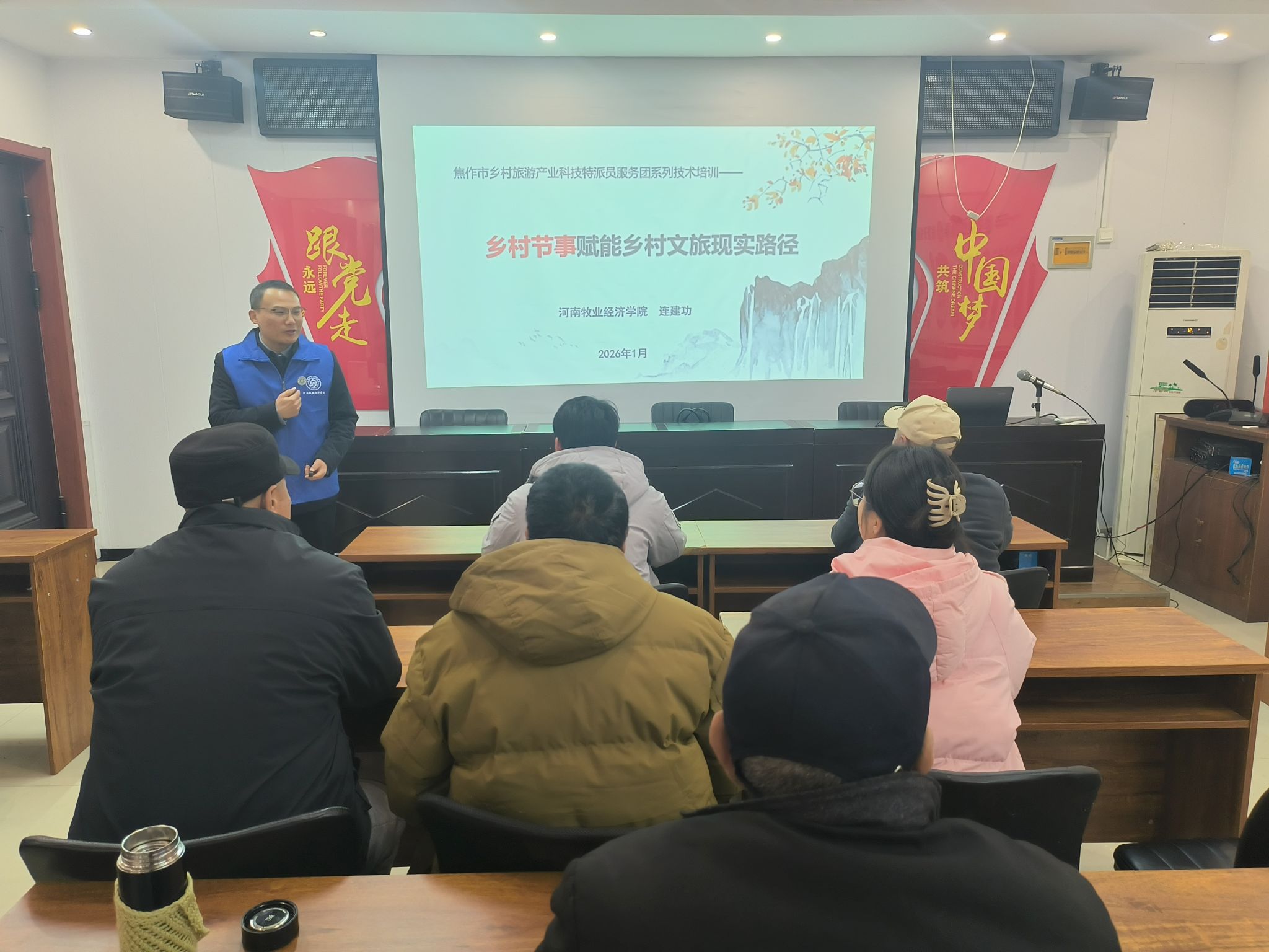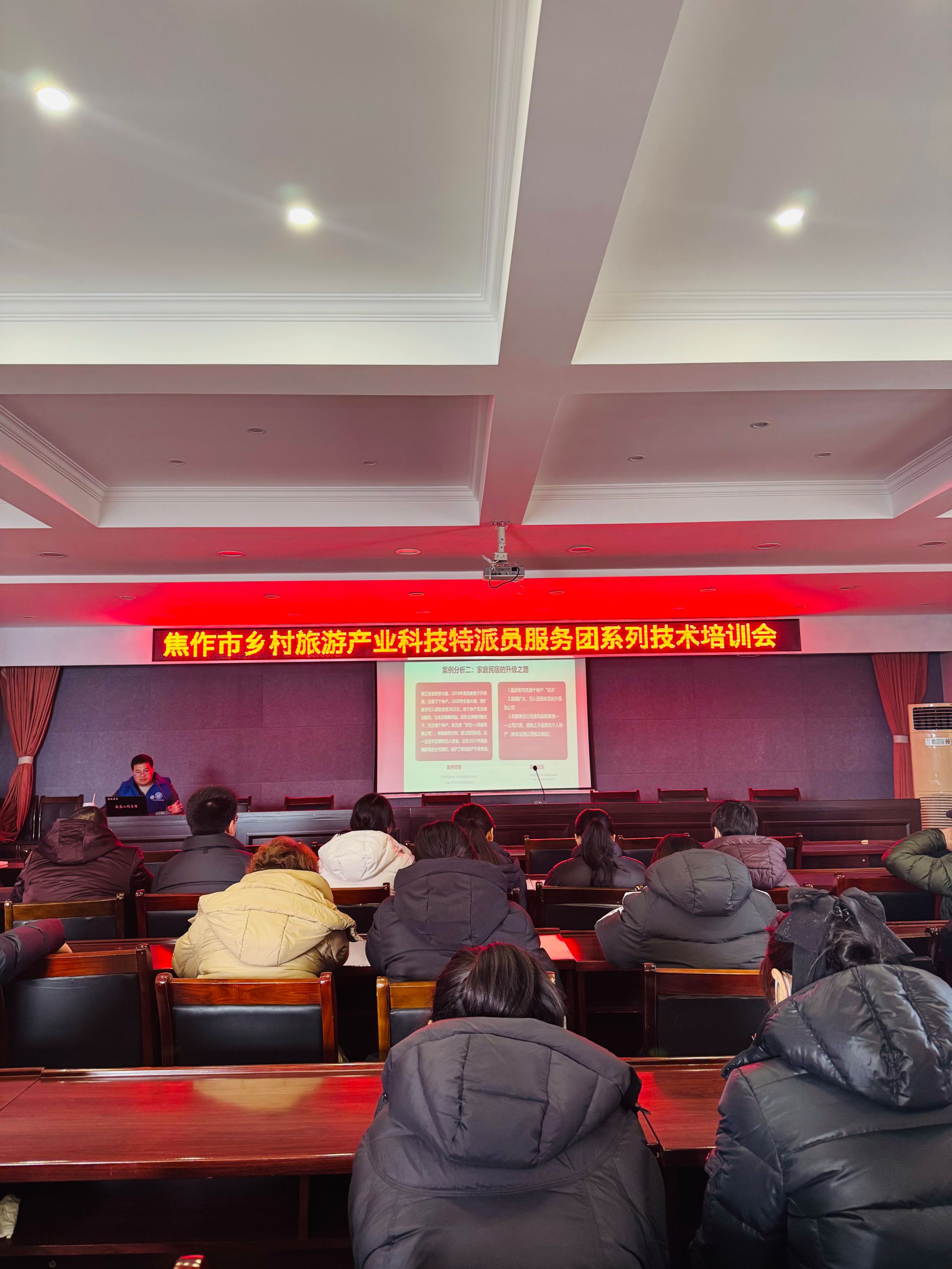 为深化乡村振兴战略实施,助力焦作市解放区乡村旅游产业高质量发展,1月28日下午,旅游学院院长王中雨带领乡村旅游产业科技特派员服务团一行4人赴焦作市解放区开展专题技术培训。当地文旅从业者、基层干部及村民代表参加培训,现场反响热烈。